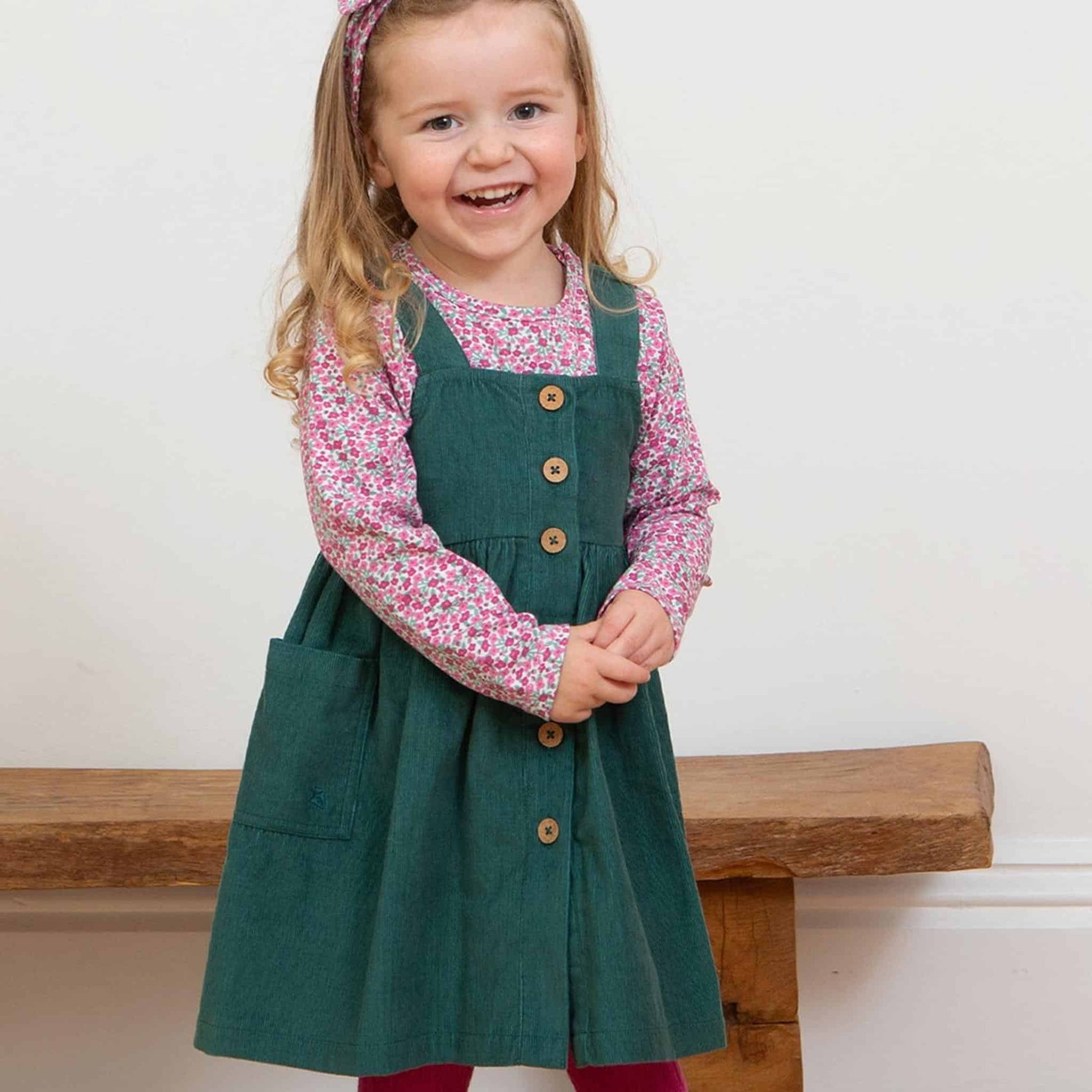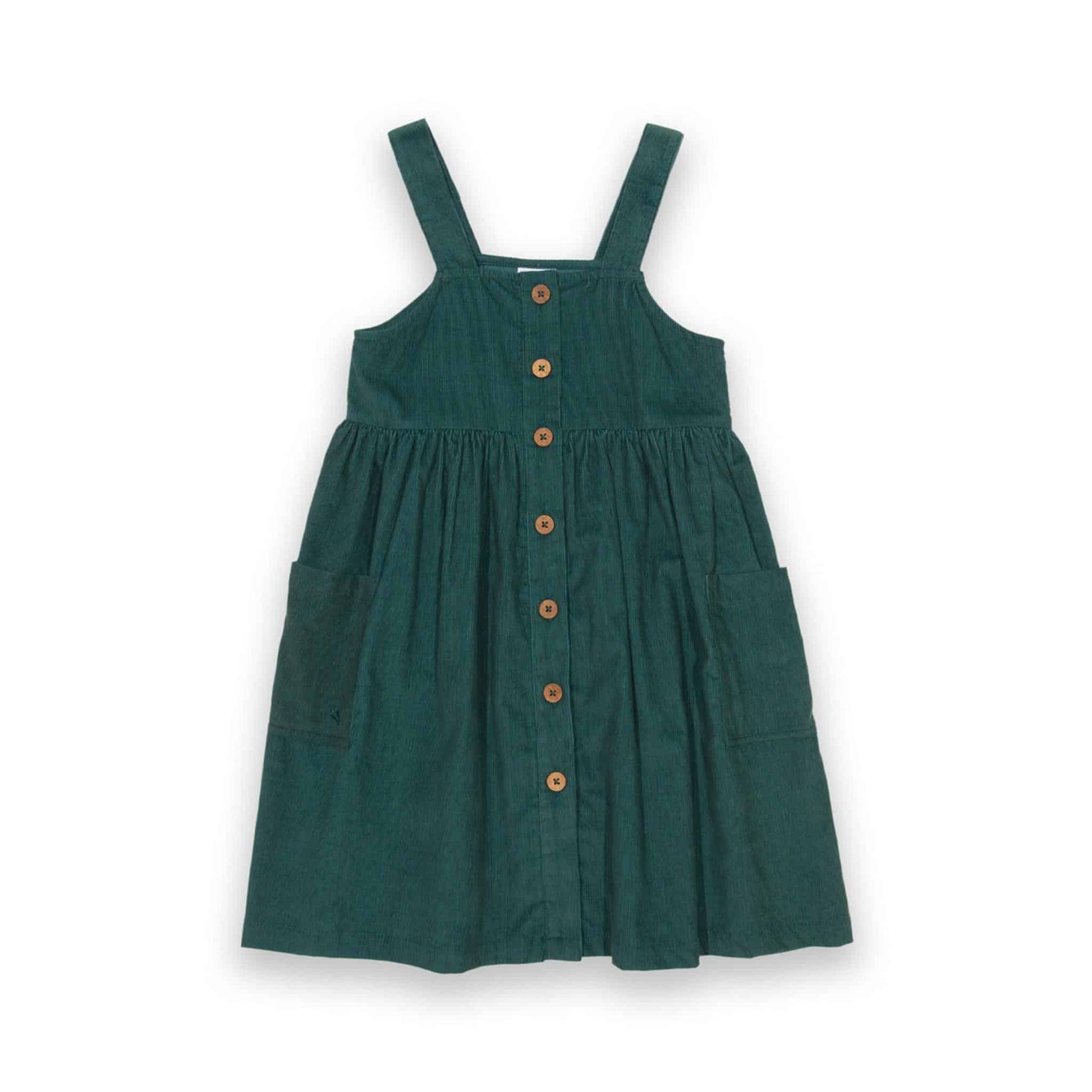 Create a timeless look with this charming pine green pinafore that will give your outfit that extra oomph. Pair it with any top or tee this season and you're good to go, but for something extra special team it with the Kite Love Hug Blouse. Enjoy 10% off the 2 items when you buy together also, as part of our bundle offering (discount automatically applied at the checkout). This dress is both comfy and functional, boasting wide straps, handy patch pockets, and delightful coconut buttons. It's bound to be a crowd-pleaser!